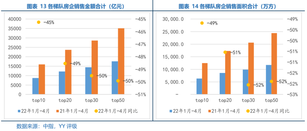 2022年1-4月top10至top50房企的累計(jì)銷售金額和售面積同比下跌幅度依次遞增。Top50房企累計(jì)銷售金額同比下跌50%,銷售面積同比下跌52%,分別較top10房企下滑百分點(diǎn)增加5.0pct和3.0pct,top50中的偏后段房企銷售下滑更大,在“蛋糕”減少的情況下,行業(yè)內(nèi)部加速割裂,中小規(guī)模房企難彎道超車。