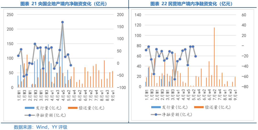 央國(guó)企境內(nèi)凈融資近三周趨勢(shì)向好,由負(fù)轉(zhuǎn)正,民企凈流出幅度收窄,仍舊未有新發(fā)行增量,但5月中旬以后將迎來(lái)大批償還,后續(xù)6、7月份仍將是到期大月,主體在持續(xù)的流動(dòng)性沖擊下將變得更加脆弱。