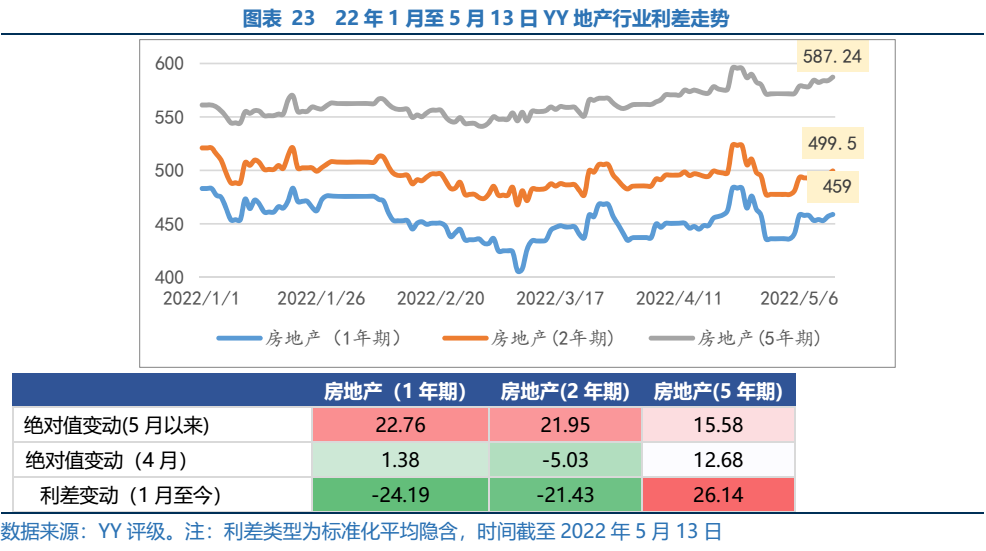 YY地產(chǎn)利差在3月初走過(guò)階段性低點(diǎn)后整體繼續(xù)呈現(xiàn)上行態(tài)勢(shì),4月1、2、5年期行業(yè)利差波動(dòng),分別變動(dòng)1.4、-5.0和12.7, 5月恢復(fù)上行趨勢(shì),1、2、5年期行業(yè)利差分別上行22.8、22.0和15.6,資金撤離民營(yíng)房企,行業(yè)估值風(fēng)險(xiǎn)未退。