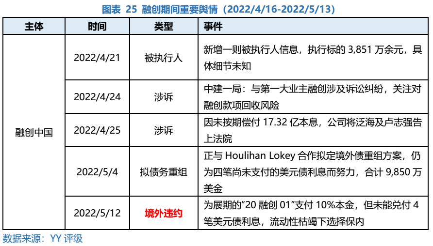 具體來(lái)看,熱點(diǎn)主體方面,融創(chuàng)一方面新增被執(zhí)行人信息、訴訟糾紛等負(fù)面輿情,另一方面由于極度枯竭的流動(dòng)性壓力,選擇“棄外保內(nèi)”:遵循展期方案部分兌付境內(nèi)展期債,而境外美元票據(jù)4筆利息違約,以避免觸發(fā)在岸銀行貸款更大規(guī)模的交叉違約,境內(nèi)外表現(xiàn)出明顯的割裂感。這也是此輪地產(chǎn)暴雷潮中一個(gè)普遍的現(xiàn)象。公司將20融創(chuàng)01展期,寄希望于以時(shí)間換空間,但3-4月份公司重點(diǎn)布局的城市受疫情影響嚴(yán)重,銷售額大幅下滑65%左右,資金回籠難度也進(jìn)一步加大。