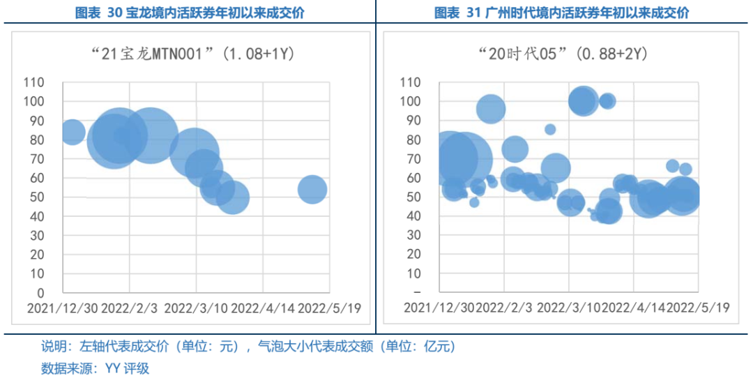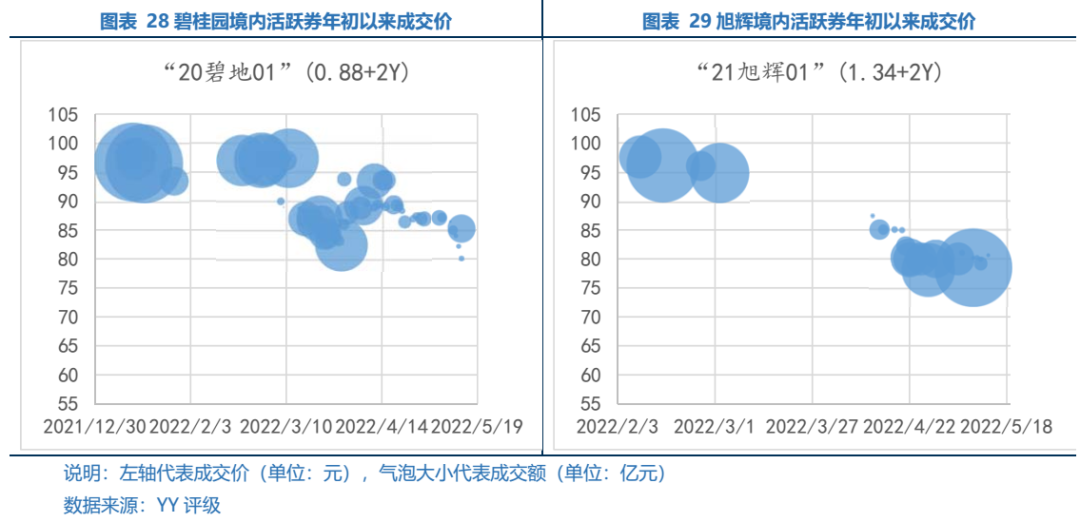 尚未展期/違約的民企方面,受行業(yè)內(nèi)主體負(fù)面信用事件影響,尚未展期/違約主體的市場(chǎng)成交價(jià)呈下探趨勢(shì),但不同資質(zhì)主體成交價(jià)區(qū)間分層。碧桂園“福州事件”引發(fā)市場(chǎng)關(guān)注,“20碧地01”價(jià)格下跌至80元左右;因旭輝22年到期的境內(nèi)債券均已到期償付,給予市場(chǎng)一定信心,“21旭輝01”自4月下旬以來(lái)成交價(jià)在80元左右徘徊;寶龍22年為債券大年,且兩度推遲披露年報(bào),“21寶龍MTN001”由80元檔一路下跌,目前成交在54元;時(shí)代向廣州市政府懇請(qǐng)退地,表明舊改項(xiàng)目資金沉淀壓力較大,“20時(shí)代05”跌至40元檔位。