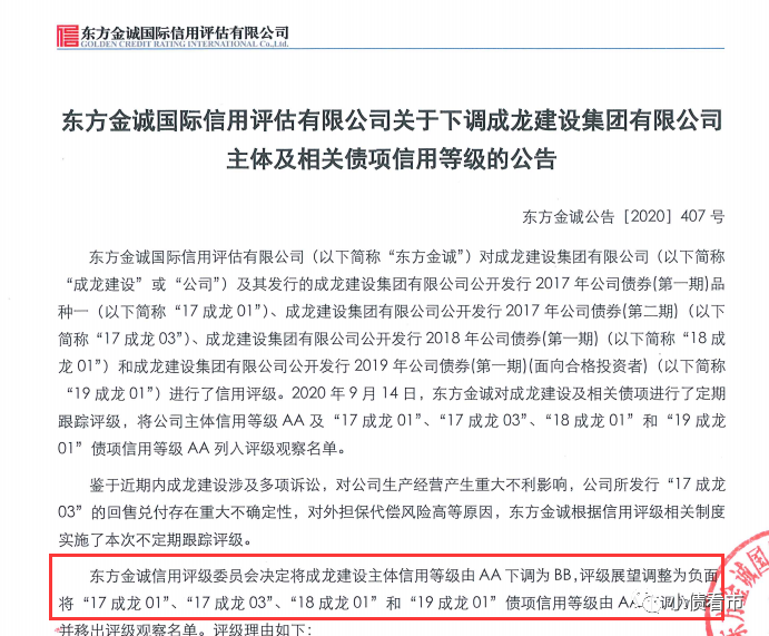 近日,東方金誠公告稱,將成龍建設集團有限公司(以下簡稱“成龍集團”)主體信用等級由AA下調為BB,評級展望調整為負面;將“17成龍01”、“17成龍03”、“18成龍01”和“19成龍01”債項信用等級由AA下調為BB并移出評級觀察名單。