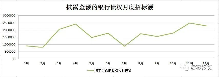 除1月外,銀行月度出讓次數曲線的區間為94-206次,區間中值為150次左右,戶數區間為827-2776戶,區間中值為1800戶左右,而月度出讓成交金額的區間中值則為350億元左右。1月和7月是公告成交的高峰期,這與業務規律也契合。