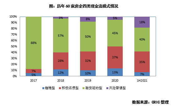 此外還需要警惕的是,2021年上半年的融資驅(qū)動型房企中,有58%的企業(yè)其融資性現(xiàn)金流無法完全覆蓋經(jīng)營及投資性現(xiàn)金流支出。下半年,這類企業(yè)應(yīng)更加重視銷售回款,做好現(xiàn)金流管理,以減輕企業(yè)的財務(wù)壓力。