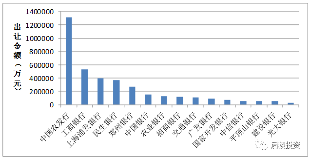 從上圖看,農(nóng)發(fā)行出讓金額遙遙領(lǐng)先,其體量甚至超過工行、浦發(fā)行和民生銀行(2-4名)三家總和。五大國有銀行中(交行、中行、農(nóng)行、建行、工行)僅工行一家位列前五。