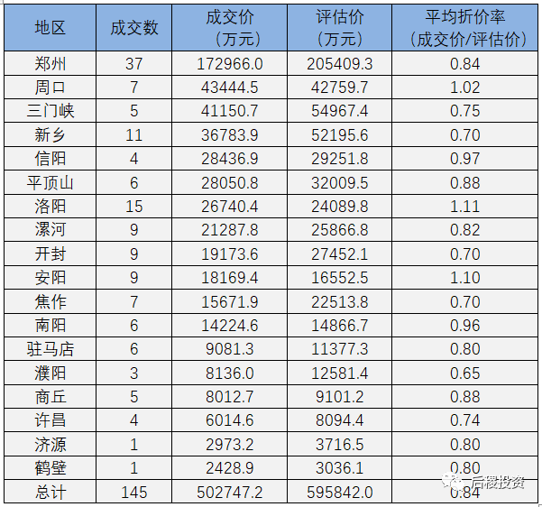 從淘寶法拍平臺中篩選出河南地區(qū)物權(quán)(超過1000萬)拍賣成交記錄,總成交數(shù)145,總成交價50.27億元,總評估價59.58億元,平均折價率為0.84。其中省會城市鄭州成交數(shù)和總成交價均最多,而平均折價率洛陽最高,達到1.11。