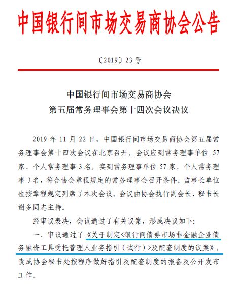 2019年11月22日,交易商協(xié)會(huì)第五屆常務(wù)理事會(huì)第十四次會(huì)議在北京召開。會(huì)議審議通過(guò)了《關(guān)于制定〈銀行間債券市場(chǎng)非金融企業(yè)債務(wù)融資工具受托管理人業(yè)務(wù)指引(試行)〉及配套文件的議案》、《關(guān)于修訂〈銀行間債券市場(chǎng)非金融企業(yè)債務(wù)融資工具持有人會(huì)議規(guī)程〉的議案》……