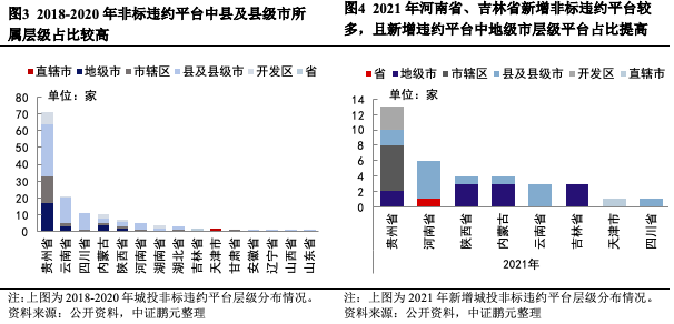 一、2021年新增城投非標違約平臺及事件數量均較上年有所增加,除貴州省、云南省、內蒙古、陜西省等非標違約重災區,河南省、吉林省新增非標違約平臺較多,且地級市平臺出現非標違約或輿情事件比例提高,發生信用風險事件的主體行政層級向上蔓延