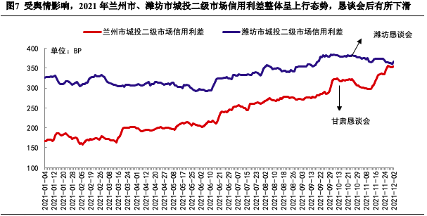 此外,2021年多個地級市主要平臺出現信用輿情事件。例如在蘭州地區地級市平臺風險事件連續發酵,2021年8月蘭州交通發展建設集團有限公司在中登網上被登記為融資租賃展期(后解釋為融資租賃公司登記有誤),且區域內多家平臺均有債券取消發行情況,受此影響,蘭州市城投二級市場信用利差持續走高。后為化解債務信用危機,甘肅省地方金融監管局于2021年10月召開投資者懇談會,提出“針對國有企業存續債券,省市兩級堅決采取過硬措施,全力推動風險化解,堅決守住不發生系統性風險的底線。”但這一系列舉措暫未見明顯效果,蘭州市城投二級市場信用利差短暫下跌后進一步上行。
