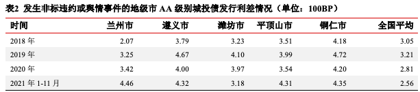2021年以來城投融資政策趨緊。直接融資方面,2021年城投債申報審批政策有所收緊,年初交易所、交易商協會依據債務風險等情況將城投公司劃分至不同檔位,且不同檔位對應不同的募集資金用途,部分被劃分至“紅檔”或“一類”的城投公司債券募集資金用途限制為償還對應場所即將到期的債券,該類城投整體債券凈融資規模壓縮。2021年1-11月,發生非標違約或輿情事件的城投債凈融資情況見下表,平涼市、銅仁市及濰坊市城投債融資呈凈流入狀態,但凈融資規模均較上年同期大幅下滑,漢中市自2020年以來已無公開債券市場融資,其余發生非標違約或輿情事件的地級市城投債凈融資額均呈凈流出狀態。表2選取2021年1-11月城投債發行規模相對較大的地區進行利差分析,除濰坊市外,2021年1-11月AA級別城投債發行利差均較上年有所上行,而全國同級別AA城投利差處于下行態勢,市場投資者對該類地區認可度下降。
