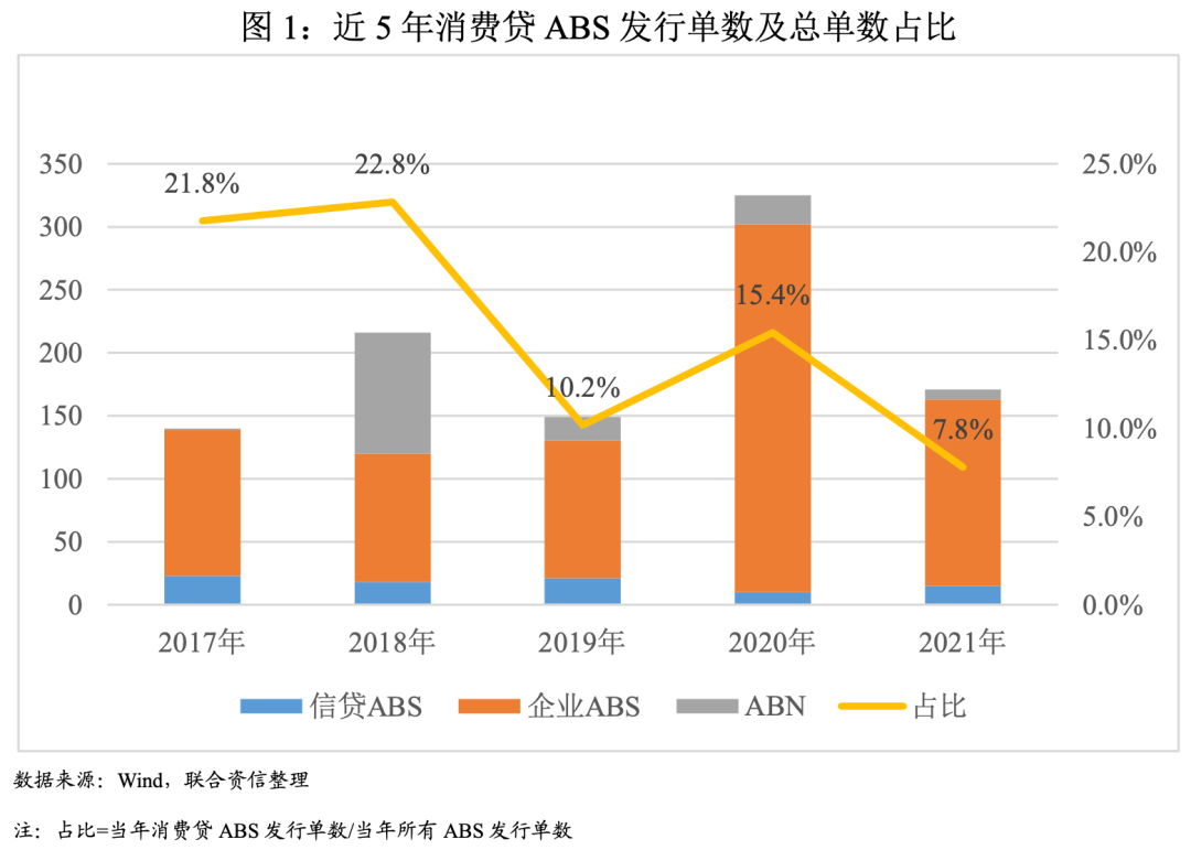 4、消費貸ABS存續期表現穩定,信用質量依然出色。2021年,消費貸ABS存續期表現穩定,未出現評級下調或違約情況。由于消費ABS基礎資產分散度高,收益率較高,內部增信效果顯著,預計未來其信用質量依然出色。