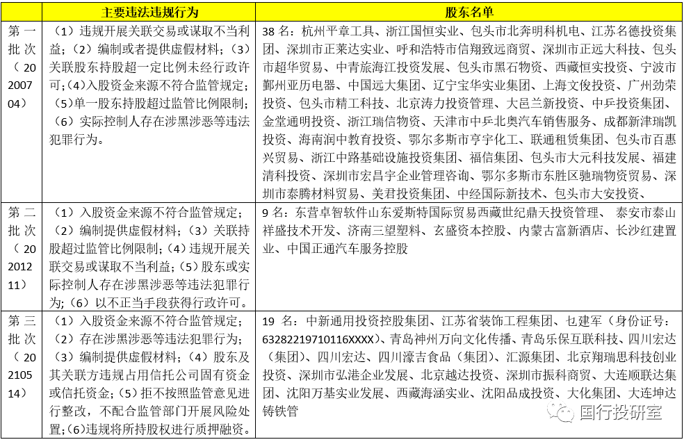 (2)2020年銀保監(jiān)會開展專項整治“回頭看”,覆蓋4600余家銀行保險機構(gòu),不僅首次開展了覆蓋全部商業(yè)銀行和保險公司的公司治理監(jiān)管評估以及銀行保險機構(gòu)股權(quán)和關聯(lián)交易專項整治工作,還先后分三批次向社會公開了銀行保險機構(gòu)重大違法違規(guī)股東(合計66家)。