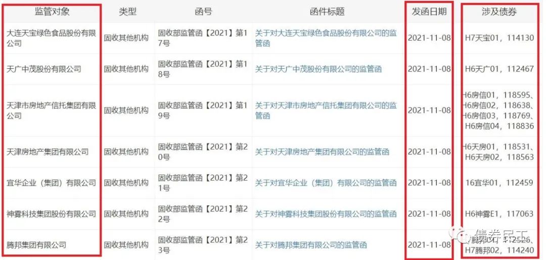 (1)根據深圳證券交易所2021年11月8日披露的公開信息,騰邦集團有限公司、神霧科技集團股份有限公司、宜華企業(集團)有限公司、天津房地產集團有限公司、天廣中茂股份有限公司、天津市房地產信托集團有限公司、大連天寶綠色食品股份有限公司等6家發行人,因為未在規定時間內披露2021年半年度報告,被深圳證券交易所予以書面警示。