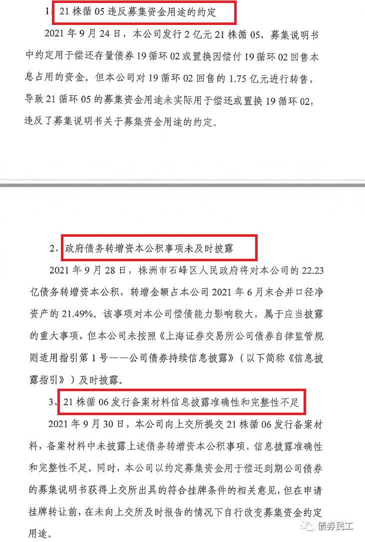 根據株洲循環經濟投資發展集團有限公司(以下簡稱“株洲循環集團”)2021年11月26日披露的公告,公司因為“違反募集資金用途的約定”、“政府債務轉增資本公積事項未及時披露”和“發行備案材料信息披露準確性和完整性不足”等問題,被上海證券交易所出具于2021年11月22日出具監管警示函(上證債監[2021]46號)。