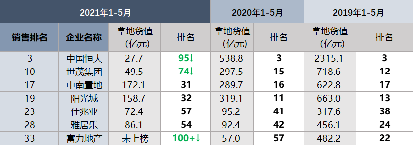 沒錯,這家企業是恒大。其2019年、2020年拿地金額始終保持前三,但其今年前五月僅支出27.7億元用于拿地。
