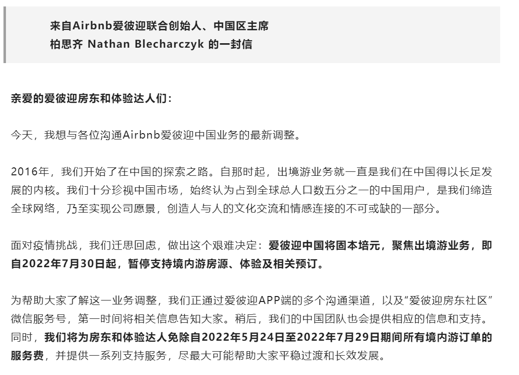 5月24日,全球民宿巨頭Airbnb(愛彼迎)聯合創始人、中國區主席柏思齊(Nathan Blecharczyk)通過“致愛彼迎中國房東和體驗達人社區的一封信”正式宣布,自2022年7月30日起,暫停支持境內游房源、體驗及相關預訂。