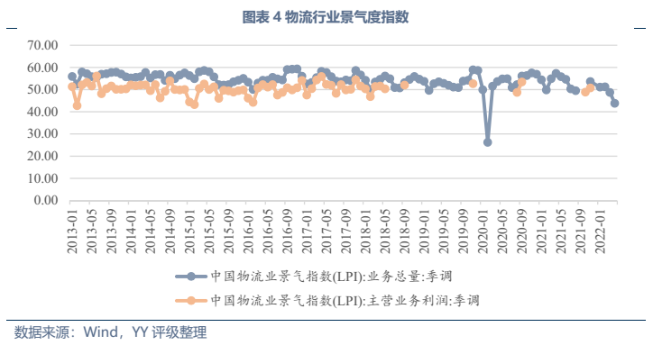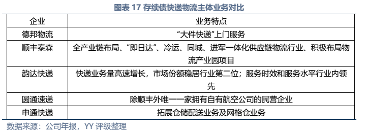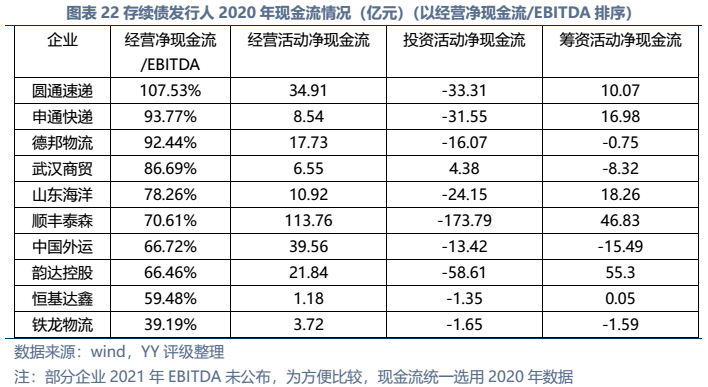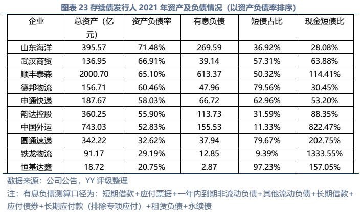 信用債市場方面,上市公司中高頻出現的“多式聯運”、“智慧物流”、“供應鏈管理”等概念在發債主體中熱度不高,主要仍以傳統物流企業為主。截至22年3月末,YY行業為物流的存續債主體共有16家,債券余額合計為402.88億元。行業整體毛利率不高(平均13%),杠桿率偏低(平均資產負債51.3%)。資質方面,貨代龍頭中國外運信用資質最好,中鐵鐵龍集裝箱背靠國鐵集團資源,信用資質也較好。快遞細分領域集中度較高,市場格局相對穩定,也有較強的經營獲現能力支撐,順豐、韻達、圓通信用資質尚可,申通快遞盈利較差,資質稍弱。濟寧港航梁山港、珠海恒基達鑫、重慶龍頭港等工業品物流企業信用資質較弱。