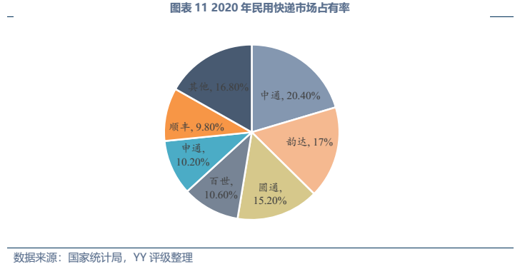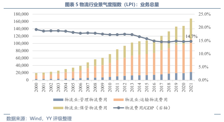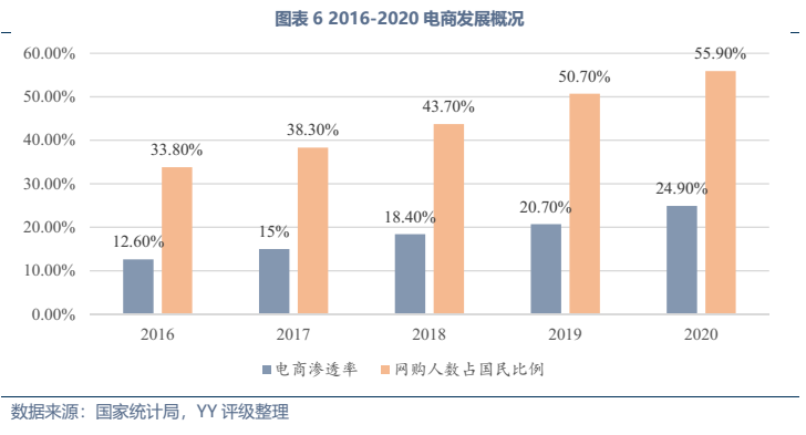 發展趨勢方面,傳統工業物流業務量上增長空間不大,未來的發展大方向仍為降本增效(近幾年我國社會物流費用/GDP徘徊在14.7%左右,較美國8%還有較大距離),同時物流企業通過向供應鏈一體化延伸、提供附加服務來挖掘新的利潤空間,與貿易、供應鏈類企業的邊界日漸模糊。而居民快遞領域,業務量上還有較大增長空間,其需求受電商滲透率、網購人數占國民比例影響,截至20年末我國電商滲透率24.9%、網購人數占比55.9%,還有較大增長空間,且網購的品類還在持續擴大。
