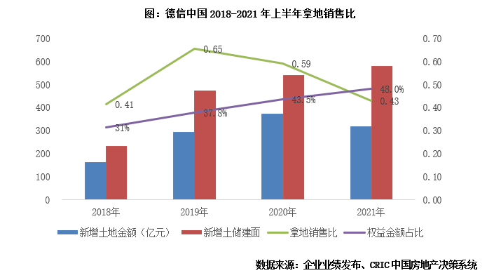 下半年拿地力度收縮明顯,新增土儲權益比例48%。2021年全年,德信中國共斬獲32宗土地,新增土儲投資總額318.0億元,新增土儲建面581.1萬平方米。拿地銷售比0.43,超出百強房企平均的0.25。主要是上半年拿地較多,下半年以來企業僅斬獲5幅土地,收縮明顯。權益方面,按拿地總價口徑,2021年德信新增土儲權益比例依然在50%以下,為48.0%,新增項目中僅1個為全資。一直以來,德信的權益占比都比較低,雖然這種模式能夠幫助企業短期沖刺業績,但是同時也大量侵蝕企業收入,造成空心化的增長。