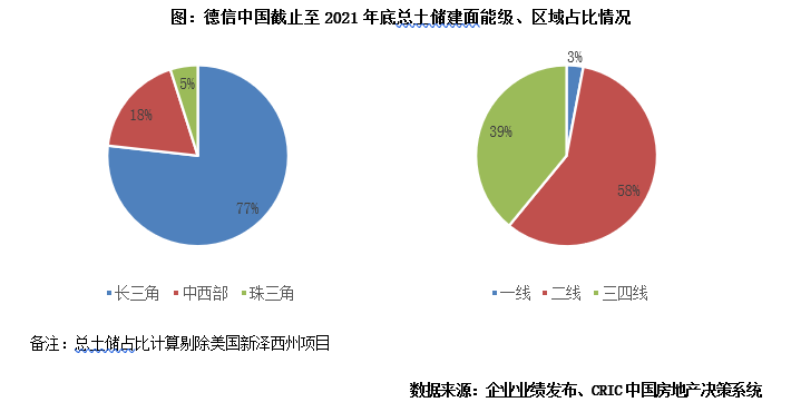 土地可滿足3年左右的發展需求,核心區域長三角土儲占比達77%。截至2021年底,德信共擁有土地儲備1913.0萬平方米,較2020年底略有下降。按照企業目前的開發銷售以及增長節奏,可以滿足3年左右的發展需要。以建筑面積口徑計算,城市能級方面,二線城市占比最高達到58%,三四線城市為39%;區域分布上,長三角區域占比高達77%,杭州作為德信大本營,單城占比達到了27.9%,溫州、寧波次之,占比達到9.9%及9.0%。