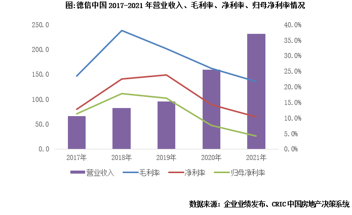 【營收與規模差異大,盈利能力接連下降】2021年德信實現營業收入231.1億元,同比增長45.6%,其中物業開發收入229.3億元,占集團總收入的99.2%。以營業收入/銷售規模來看,2020年德信這一比例僅有25%,低于百強上市房企2020年46%平均水平的21個百分點,今年該比例依然很低,只有31%。2021年德信中國實現毛利潤50.1億元,同比上升22.0%,整體毛利率21.8%,同比下滑4.2個百分點。實現凈利潤23.8億元,凈利率10.3%,相較2020年同期下滑3.9個百分點,實現歸母凈利潤9.4億元,歸母凈利率僅4.1%。從盈利能力來說,企業的各項指標已經連續3年出現下滑,尤其是大量的合作項目侵蝕收入,導致企業歸母凈利率只有4.1%
