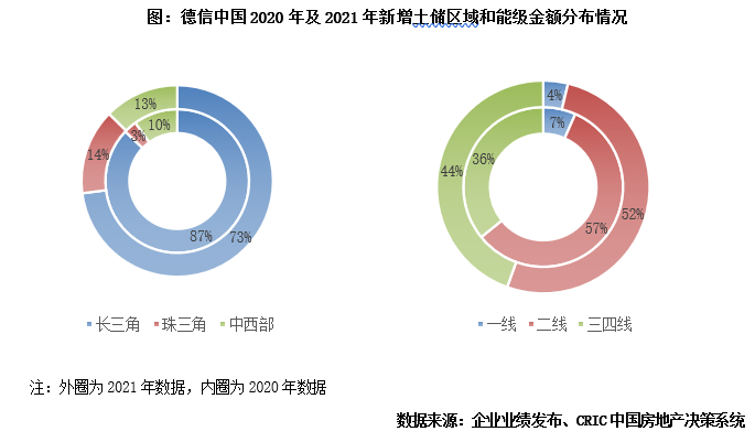 外拓加強,聚焦一二線及長三角、珠三角三四線。德信始終堅持立足浙江,深耕長三角,聚焦四大都市圈的布局策略。以金額口徑計算,2021年新增土儲中73%位于長三角區域,相較2020年下降14個百分點,但仍居于首位。外拓方面主要是在珠三角和中西部兩區域投資提升,其中珠三角區域重點布局了漳州、廣州、佛山三城,占比提升11個百分點至14%。城市能級方面,二線仍是德信布局的重點核心,拿地金額占比達52%,較2020年略有下降,三四線城市拿地金額上升至44%,但均位于長三角和珠三角。
