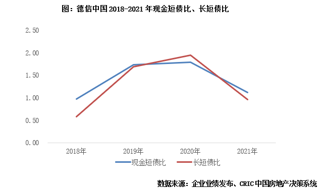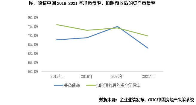 債務指標優化,剔預資產負債率降至監管線以下。根據企業公告,截至2021年底,德信的凈負債率為63%,相較2020年底下降,剔除預售賬款后資產負債率為69.6%,成功降至監管標準的70%以下,達到監管要求。