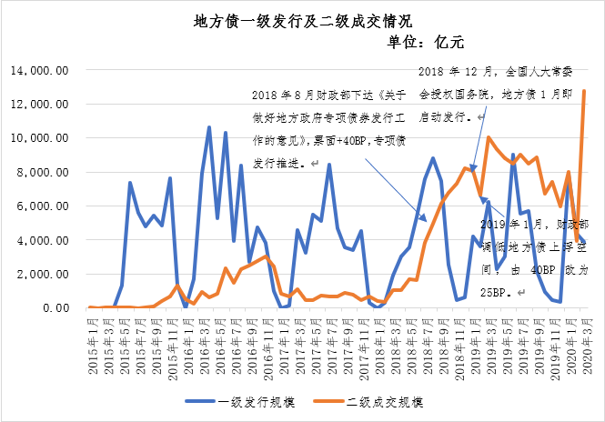 所謂地方債發(fā)行節(jié)奏改革,即根據(jù)2018年8月財(cái)政部所頒布《意見》要求,各地區(qū)加快專項(xiàng)債發(fā)行進(jìn)度,當(dāng)月地方債發(fā)行規(guī)模即創(chuàng)出歷史新高,疊加彼時(shí)上浮40BP的票面政策,一二級(jí)市場(chǎng)存在較大套利空間,量升價(jià)優(yōu),地方債二級(jí)市場(chǎng)交易量也創(chuàng)出新高。其后,為提升地方債對(duì)基建拉動(dòng)效用,平衡全年發(fā)行節(jié)奏,2018年末全國(guó)人大常委會(huì)授權(quán)國(guó)務(wù)院可提前下達(dá)下一年度部分地方債務(wù)額度。受此影響,自2019年1月開始,地方債一級(jí)市場(chǎng)一季度就形成“開門紅”局面,發(fā)行量遠(yuǎn)高于四季度,該局面一直延續(xù)至今日。該制度改革的伴生影響則是,一季度地方債交易活躍度也大幅提升,部分時(shí)間高于受獲利了解影響交易規(guī)模大增的四季度。