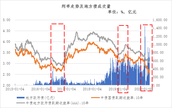 地方債一級(jí)發(fā)行對(duì)二級(jí)交易量影響,主要體現(xiàn)在兩個(gè)方面,一是地方債票面利率改革;二是地方債發(fā)行節(jié)奏改革。所謂票面利率改革,即2018年8月財(cái)政部下達(dá)《關(guān)于做好地方政府專項(xiàng)債券發(fā)行工作的意見》(以下簡(jiǎn)稱《意見》),各省市地方債票面利率錨定在國(guó)債基準(zhǔn)+40BP。由本圖即可發(fā)現(xiàn),自該文件頒布后,地方債二級(jí)成交活躍度快速上行。畢竟,在國(guó)債基準(zhǔn)上浮40BP,與當(dāng)時(shí)二級(jí)估值相比,存在較大套利空間。很多機(jī)構(gòu)一級(jí)獲配之后,二級(jí)直掛OFR,穩(wěn)穩(wěn)套利收益到手,這也在短期內(nèi)催發(fā)了地方債的二級(jí)交易熱度。但在2019年1月,財(cái)政部調(diào)低了地方債上浮空間,由40BP改為25BP,當(dāng)月地方債一級(jí)發(fā)行規(guī)模呈現(xiàn)上行趨勢(shì),但二級(jí)交易規(guī)模卻當(dāng)即回落。足見票面利率對(duì)地方債一二級(jí)套利所帶來(lái)影響,會(huì)明確傳遞至二級(jí)市場(chǎng)交易量,甚至影響權(quán)重強(qiáng)于一級(jí)發(fā)行市場(chǎng)。