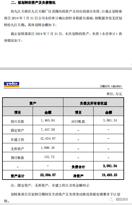 從該公告內(nèi)容獲悉,九江天賜高新材料有限公司(以下簡稱“九江天賜”是廣州天賜高新材料股份有限公司全資子公司,九江天祺氟硅新材料科技有限公司(以下簡稱“九江天祺”)是九江天賜全資子公司。為了推動公司業(yè)務(wù)結(jié)構(gòu)梳理,提升公司運營效率和管理水平,結(jié)合公司未來發(fā)展規(guī)劃的目的,九江天祺(轉(zhuǎn)讓方)把名下部分資產(chǎn)無償劃轉(zhuǎn)給九江天賜(受讓方),劃轉(zhuǎn)資產(chǎn)情況如下: