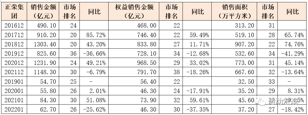 特別是若從2021年全年和2022年1月的銷售數(shù)據(jù)來看,正榮銷售端的壓力均比較突出,如銷售金額同比分別下滑6.79%和25.62%,權(quán)益銷售金額同比分別下滑18.26%與37.35%,銷售面積同比分別下滑13.64%與18.42%。