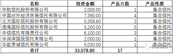 根據(jù)界面新聞的報道,“17騰邦01”債券違約之后的訴訟,泄露出13家機(jī)構(gòu)名單(報道詳見https://www.jiemian.com/article/6122466.html)。而讓債券民工很意外的是,這13家機(jī)構(gòu)名單中,共有7家信托公司,涉及了17只集合信托產(chǎn)品!債券民工根據(jù)公開信息整理了這7家信托公司在“17騰邦01”中的具體投資情況,詳見下表: