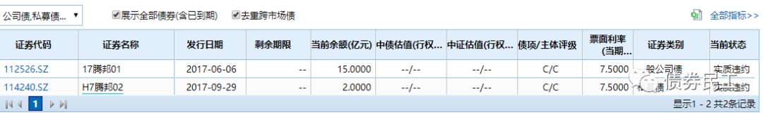 “17騰邦01”的 發(fā)行人為騰邦集團(tuán)有限公司,實(shí)際控制人為鐘百勝。騰邦集團(tuán)有限公司為。騰邦集團(tuán)有限公司2019年6月10日發(fā)生債券實(shí)質(zhì)性違約,目前存續(xù)兩只債券,均已實(shí)質(zhì)性違約,債券存續(xù)金額為17億元。