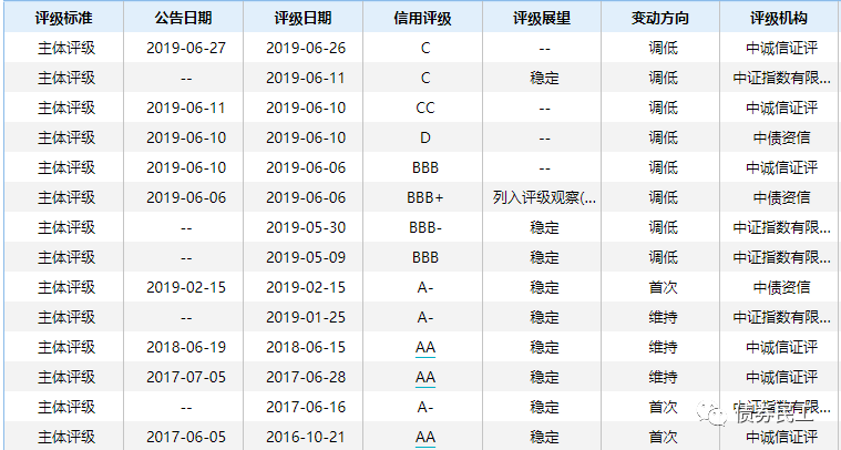騰邦集團(tuán)有限公司的主體信用評級已經(jīng)從2016年的AA下調(diào)至C,信用評級呈現(xiàn)斷崖式下跌。