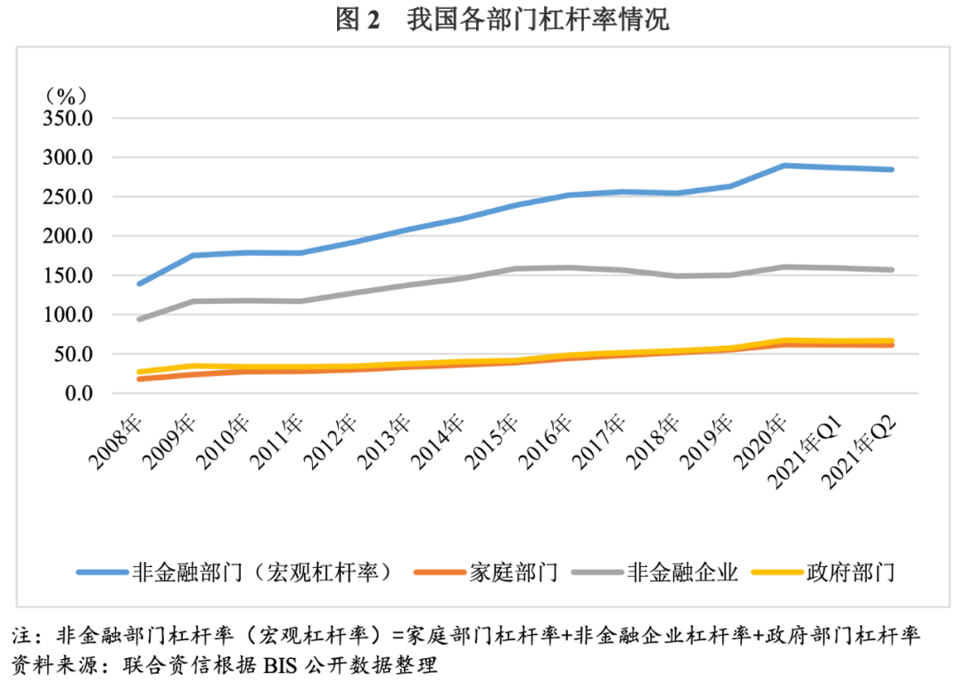 我國宏觀杠桿率經過早年的快速提升,截至2020年底已達289.6%,與英國、美國和歐元區國家水平基本相當。2021年上半年,我國宏觀杠桿率再次回落;2021年6月底我國宏觀杠桿率較2020年底下降4.9個百分點至284.7%,在BIS統計公布的44個國家和地區當中處于第20位(按宏觀杠桿率由高到低排序)。