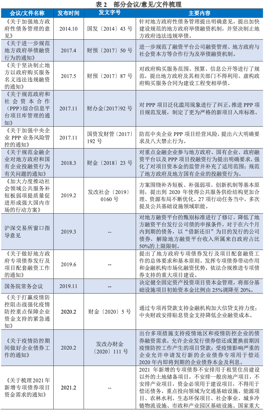2008年全球金融危機爆發,我國政府為進一步擴大內需、促進經濟平穩較快增長,安排了總規模達4萬億元的中央投資資金,投向主要為保障性住房、棚戶區改造、鐵路、公路、機場、水利、醫療衛生、教育等基礎設施建設。基礎設施建設投資作為我國拉動內需穩定經濟的重要途徑,城投企業在這當中起到了重要作用,但大規模的投資計劃也使得城投企業所負擔的債務快速上升。2014-2018年間,我國針對地方政府和城投企業的相關政策監管均較為嚴格,在防范化解地方政府債務風險的同時也逐步規范了地方政府及地方國有企業的投融資行為。2019年,宏觀經濟下行壓力加大,滬深交易所窗口指導放松了對城投公司的發債限制;2020年,新冠肺炎疫情全球化流行,我國在防范風險的同時也推行了適當的擴張政策拉動內需,穩定經濟增長,各項結構性寬松的政策直接或間接地為城投企業提供了較好的再融資環境。2021年,各項政策對地方政府隱性債務的管控及債券資金的使用效率提出了新的要求,償債風險及地方政府隱性債務風險的防范化解工作持續實施。