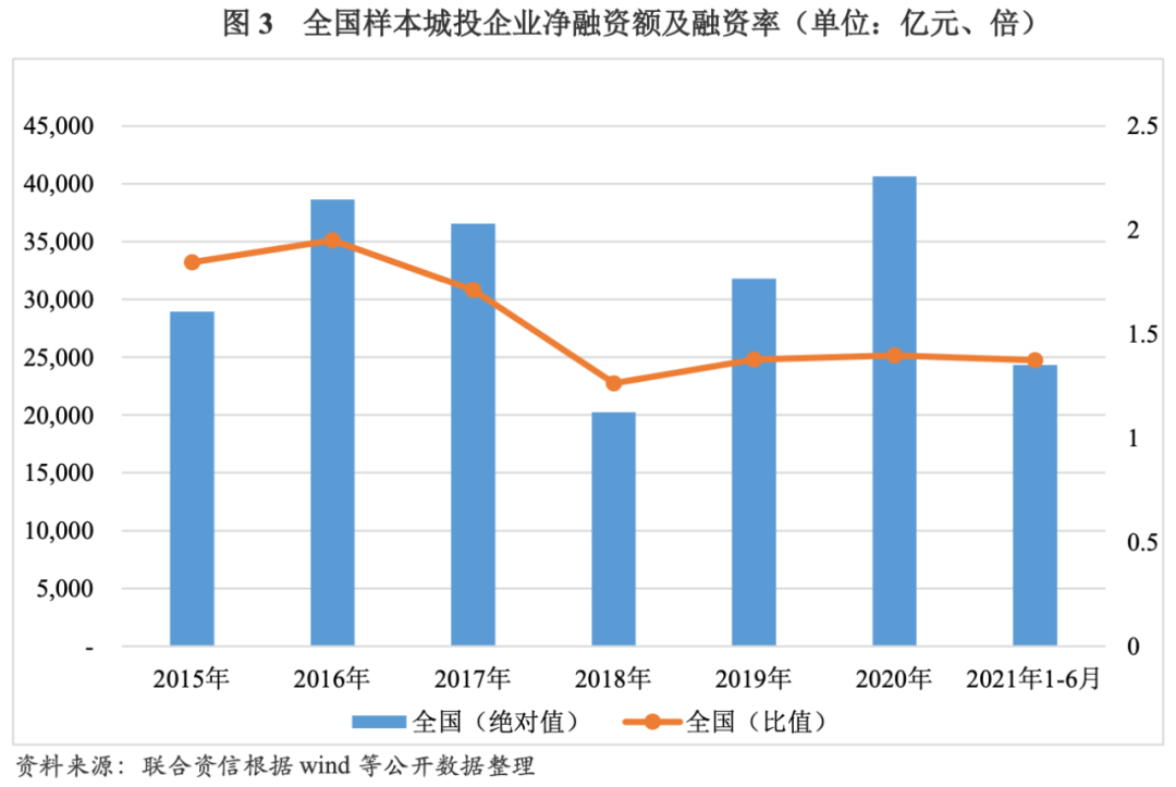 2015年至2021年上半年,樣本城投企業凈融資情況在絕對值和比值的表現形式下呈相同走勢,且與非金融企業杠桿率同趨勢變化。不同區域、信用級別樣本城投企業凈融資情況對監管政策寬松程度的敏感及響應速度有所不同,其中所在區域經濟相對較弱、信用級別較低的樣本城投企業在監管政策趨緊時,外部融資環境更為嚴峻;區域經濟相對較強、信用級別較高的樣本城投企業在嚴監管下韌性較強。