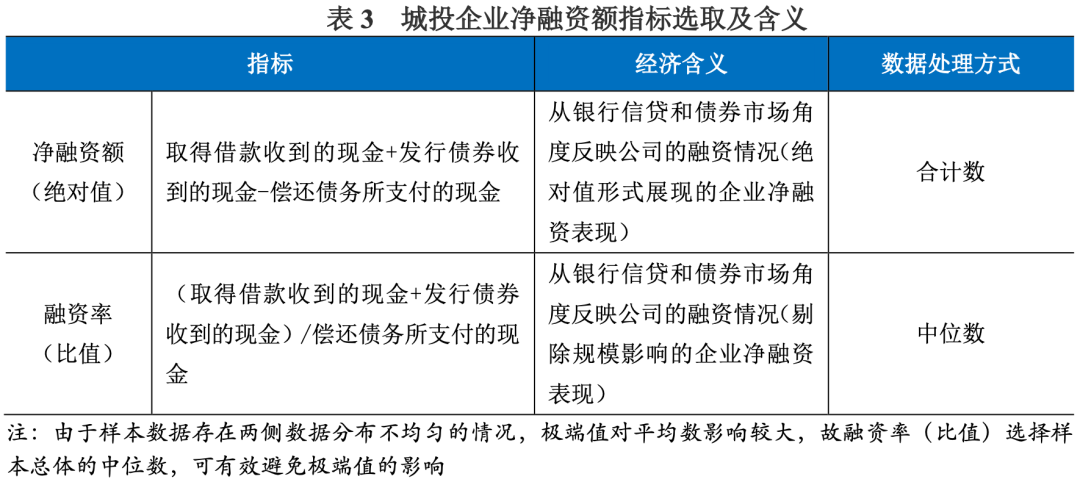 城投企業以銀行借款、債券發行等為主要融資形式,資金流入對應體現在現金流量表中的“取得借款收到的現金”和“發行債券收到的現金”兩個科目[1],資金流出對應體現在現金流量表中的“償還債務所支付的現金”科目。本文選取絕對值、比值兩個指標,展現城投企業的融資缺口情況。對于凈融資額(絕對值)指標而言,零值是一個很重要的分界點,當指標為正時表示企業債權形式融資資金流入量大于流出量;當指標為負時表示企業債權形式融資資金流入量小于流出量。融資率(比值)指標在分母設置“償還債務所支付的現金”,主要考慮了企業規模對凈融資額的影響,1是該指標的重要分界點,當指標大于1時表示企業債權形式資金融入量大于償還量,小于1時表示企業債權形式資金償還量大于融入量。