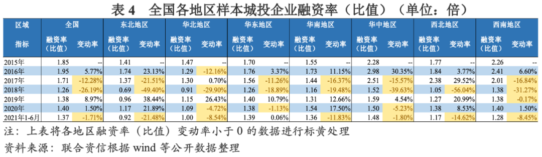 2016年,除華北地區外,其余地區融資率(比值)均較2015年有所增長,保持在1.5倍以上;2017年,除西北和華北地區融資率(比值)上升外,其余地區融資率(比值)均較2016年有不同程度的下降,其中東北地區經濟相對薄弱,在監管政策收緊時,降幅最為明顯;華東地區融資率(比值)則表現出較強韌性,降幅最小。2019年6月《關于做好地方政府專項債券發行及項目配套融資工作的通知》出臺,釋放基建項目融資利好消息,除了西南地區融資率(比值)略有下降外,其余地區樣本城投企業融資率(比值)均有所回升。2020年,新冠肺炎疫情對出口與消費均造成不同程度的影響,我國經濟增速放緩,基礎設施建設發揮托底效應,城投企業融資環境有所放松,東北地區、西北地區、華南地區及西南地區融資率(比值)較2019年均有不同程度增長,但基本在1.50倍以下。