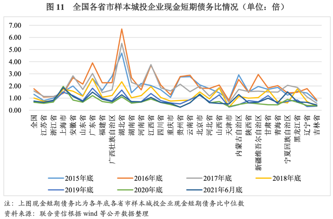 2015-2016年,全國信用政策較為寬松,2015年底和2016年底樣本城投企業現金短期債務比分別為1.31倍和1.77倍,整體流動性水平尚可。2017-2020年,在降杠桿背景下,樣本城投企業現金短期債務比呈逐年下降趨勢,由2017年底的1.59倍降至2020年底的0.66倍,城投企業流動性持續趨緊。其中,在監管政策大幅收緊的2018年,樣本城投企業流動性壓力顯著增加。2021年6月底,樣本城投企業現金短期債務比較2020年底有所上升,但仍存在一定流動性壓力。