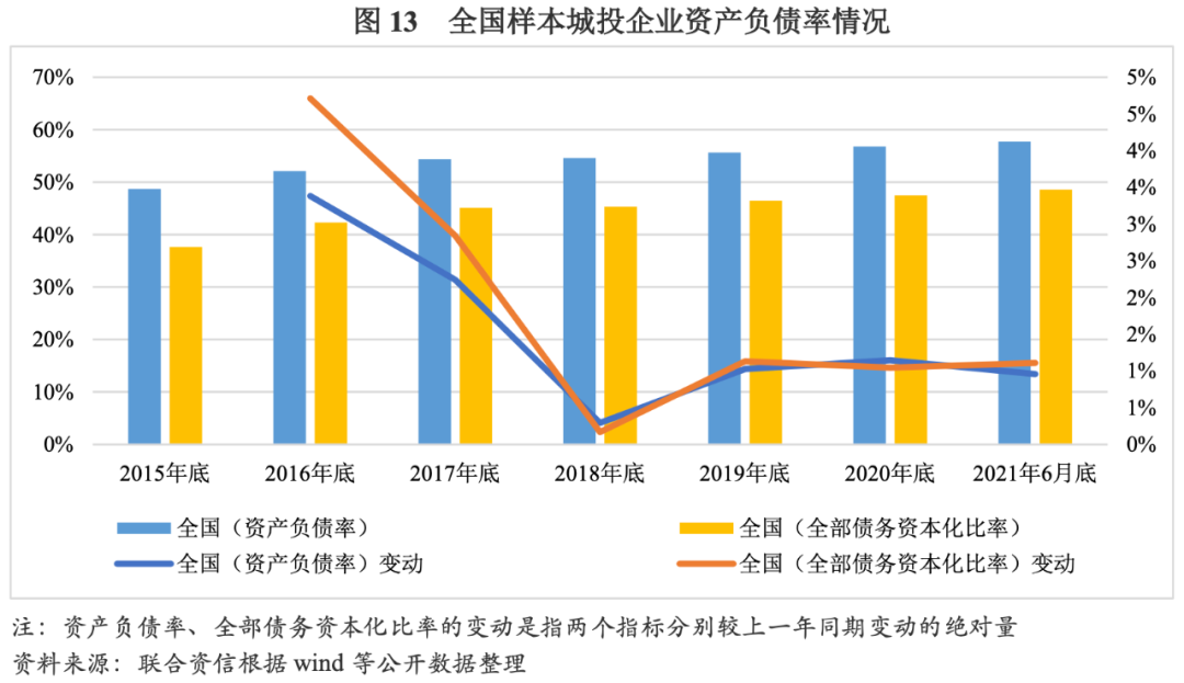2015-2020年,樣本城投企業資產負債率及全部債務資本化比率均持續上升,但增速自2018年后逐步趨緩;2021年上半年,樣本城投企業資產負債率、全部債務資本化比率增長幅度均較2020年底呈下降趨勢。