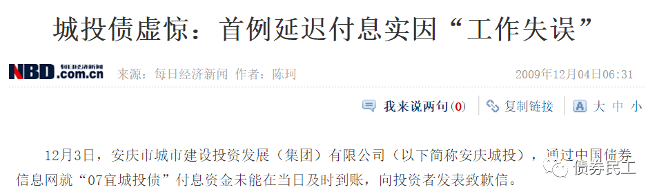 安慶市城市建設投資發展(集團)有限公司于2007年11月30日發行了“2007年安慶市城市建設投資發展(集團)有限公司公司債券”(以下簡稱“07宜城投債”),付息日為每年的11月30日。“07宜城投債”本應該于2009年11月30日本期債券2009年度的支付債券利息,但是實際上支付時間為2009年12月1日,延遲了一天。安慶城投發布致歉信,明確利息延遲支付的原因是工作失誤。