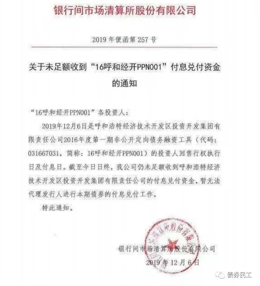 根據公開信息,2019年12月9日,“16呼和經開PPN001”在經過一個周末的技術性違約之后,最終以陸續兌付。