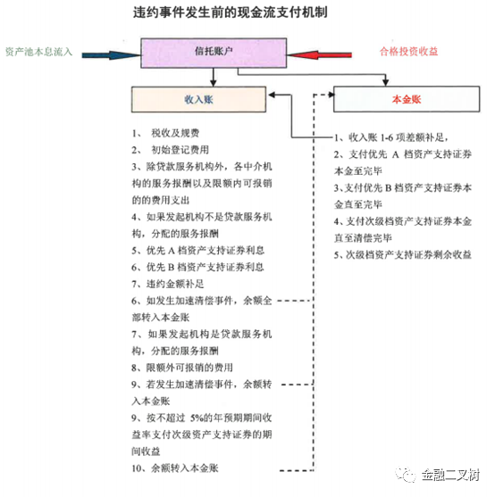 上圖所示產品有A、B檔兩個層級及次級,當出現違約事件后,償付順序是優先A檔本金、利息   優先B檔本金、利息   次級本金及超額收益。當優先A檔本息正常兌付時,而B檔本息無法正常兌付時,優先B檔發生實質違約,而當次級本金損失,而優先A、B檔正常兌付本息時,小編認為沒有發生實質違約,風險事件會影響現金流分配但不一定導致違約。