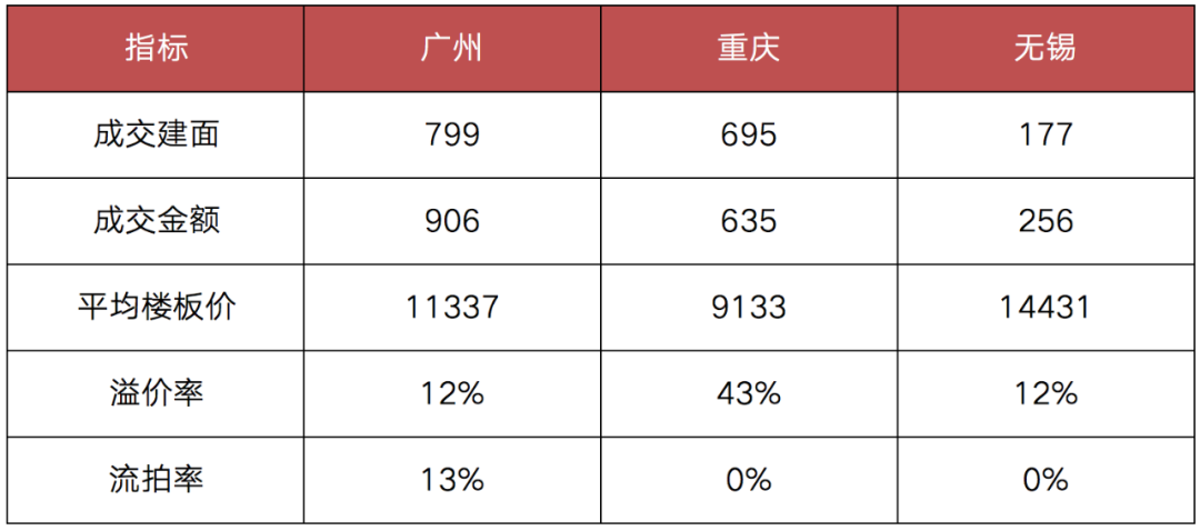 4月26日~4月29日,廣州、無錫、重慶迎來了第一場集中拍地。具體來看,廣州共有48宗土地入市,成功出讓42宗,流拍6宗,共攬金超906億元;重慶主城區46宗涉宅地全部成功出讓,土地成交總金額達到635億元;無錫首批16宗地中已成功出讓10宗,總成交金額也超過了兩百億元。
