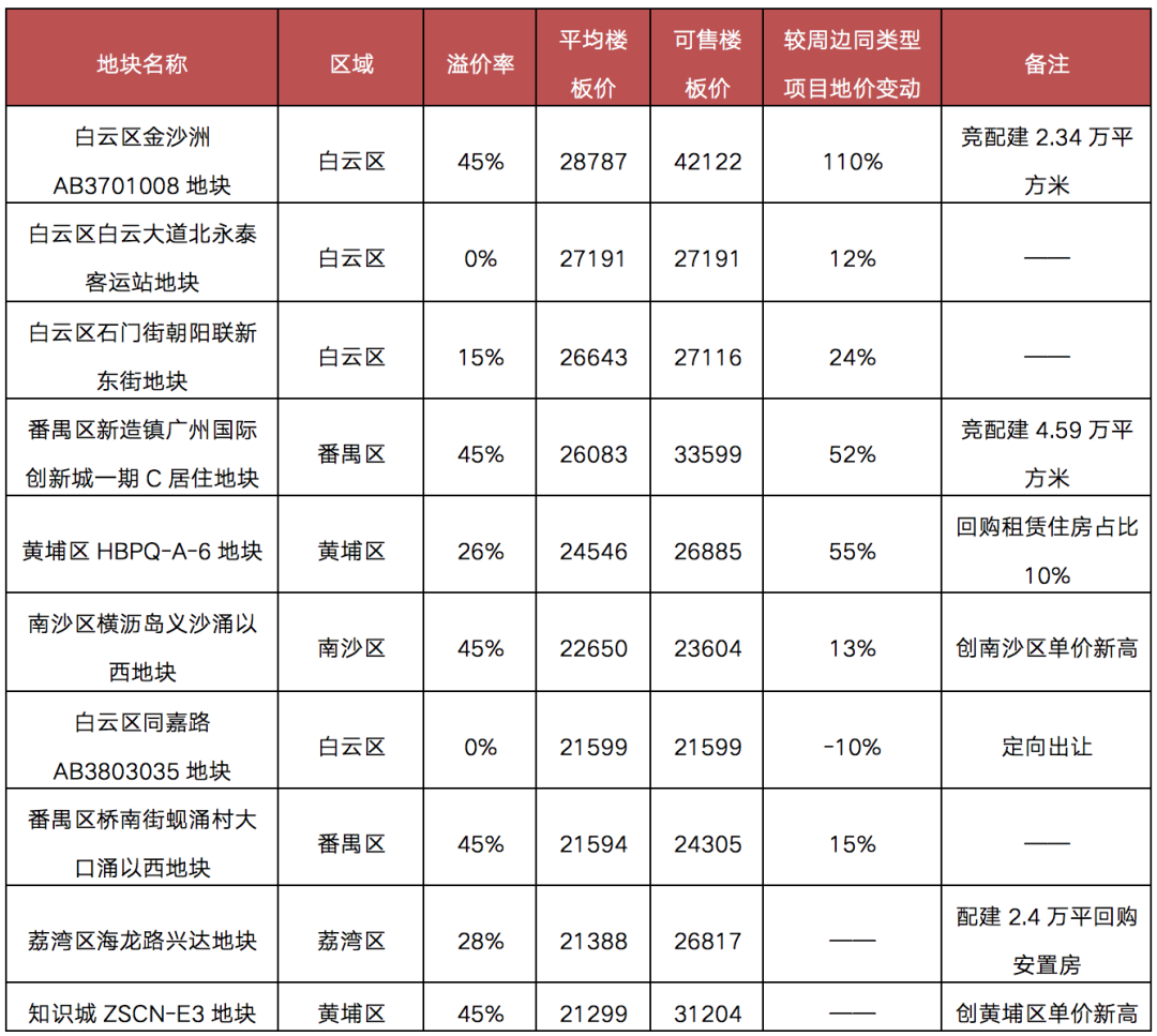 表:廣州成交宅地中單價TOP10地塊樓板價