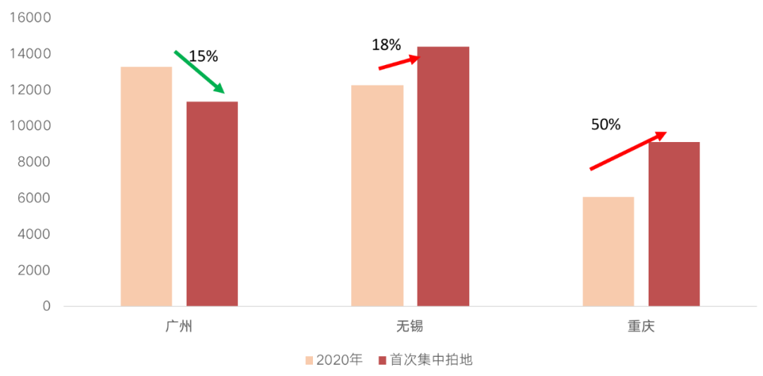 從地價水平來看,與2020年全年涉宅地價格相比,三城中重慶、無錫地價漲幅明顯,僅廣州成交地價不及去年水平。