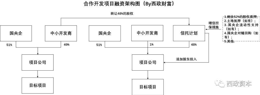 1. 股權轉讓:中小房企將其持有項目公司48%的股權轉讓給信托計劃,信托計劃向該中小房企支付股權轉讓價款。