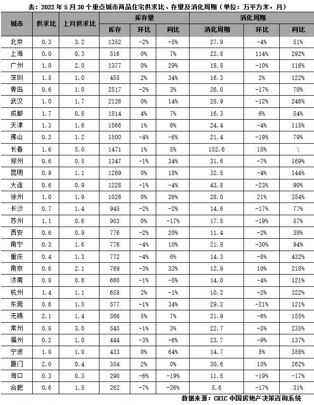 5月整體市場環比供應繼續下降而成交微增,故整體供求情況改善。監測的30個重點城市供求比普遍降低,除深圳、廈門、成都、無錫等8城供求比增加。長沙、合肥、重慶、、南京、南寧和三四線中佛山、東莞已由供過于求轉向供小于求。5月連番新政對新房市場已有一定成效。