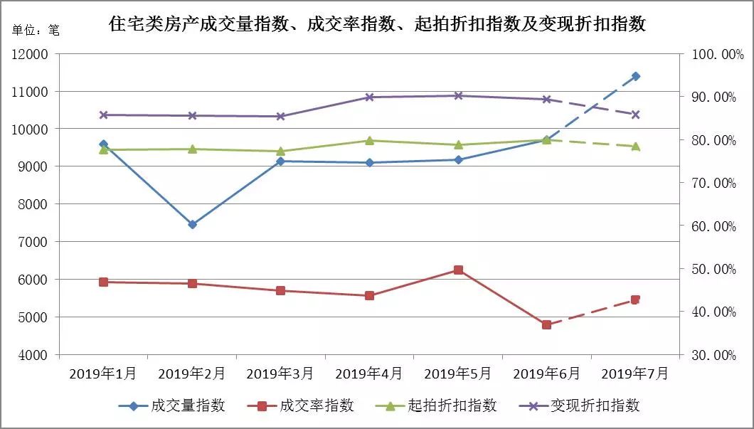 • 七月預測:成交量在302至357筆左右,成交率指數區間[21.46%,22.57%],起拍折扣指數區間[77.51%,78.76%],變現折扣指數區間[99.41%,106.55%]。